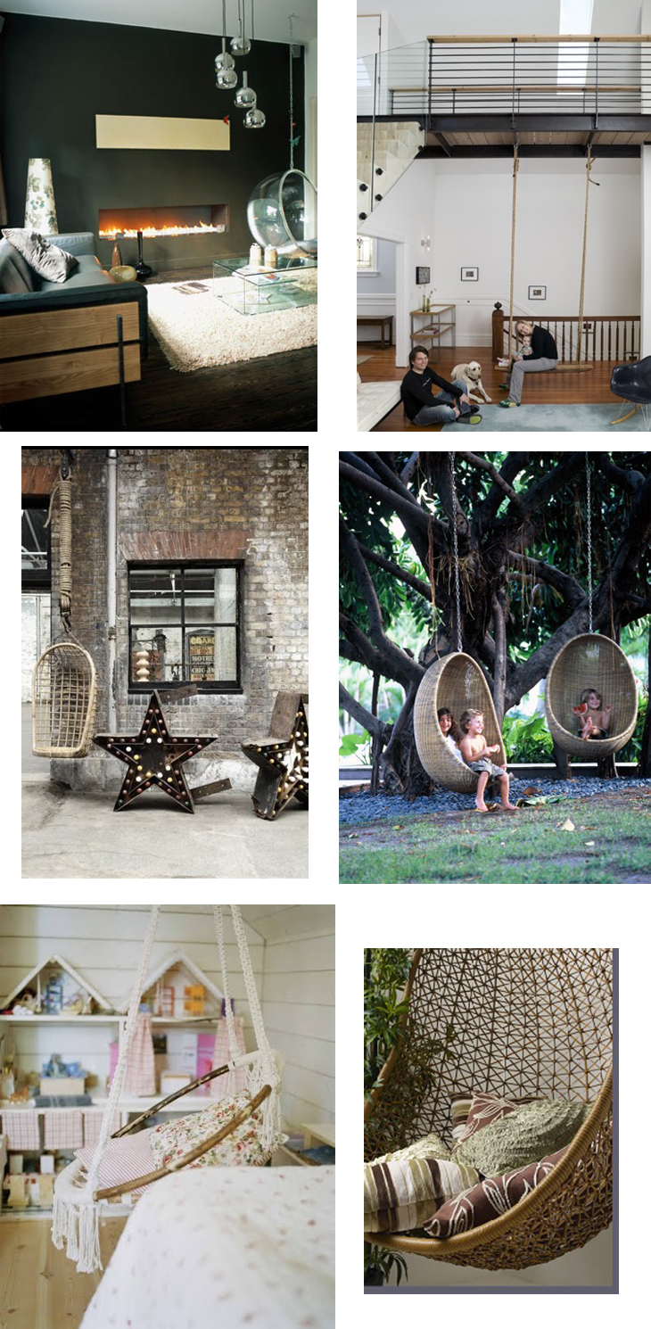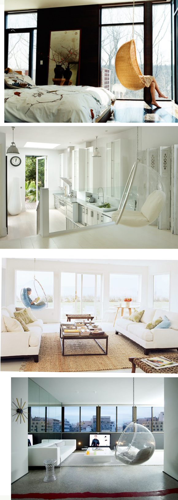 This summer while I obsessively collected photographs, I started noticing more than a few swings popping up indoors. As a child I had a fantasy of living in a home with exposed beams across a high ceiling that would allow my parents to rig up a swing. Unsurprisingly, it never happened, nor will it happen for my kids. (Not that they’ve expressed an interest.) While I had imagined a simple wooden slab and rope, the swings in these rooms are either oval wicker designs or funky Lucite orbs that pay homage to ’70s style. Fun!