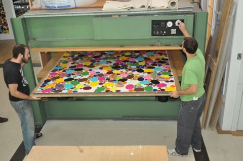A Polly Apfelbaum Dogwood print in the press at Durham Press