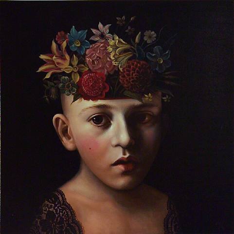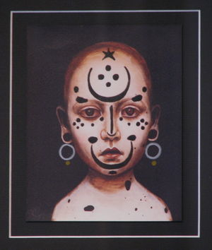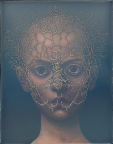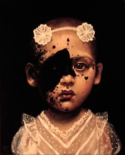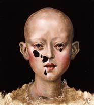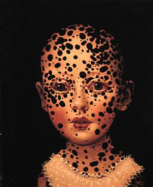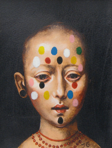 Over the weekend I chatted with Tyler Doran of Heir Antiques in Providence. I hope to actually visit his shop sometime soon. He has an amazing eye for the creepy and refined. One of the items that caught my eye on his 1st Dibs page is the colorful spot portrait below, by artist Timothy Cummings. Turns out he’s done a whole series of such works. Some are quite disturbing, but some are eerily beautiful.