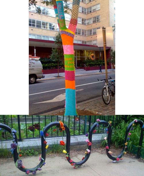 Knit tree covering as seen in Philadelphia Weekly and garland on a bike rackcreated by the South End Knitters club in Boston.
