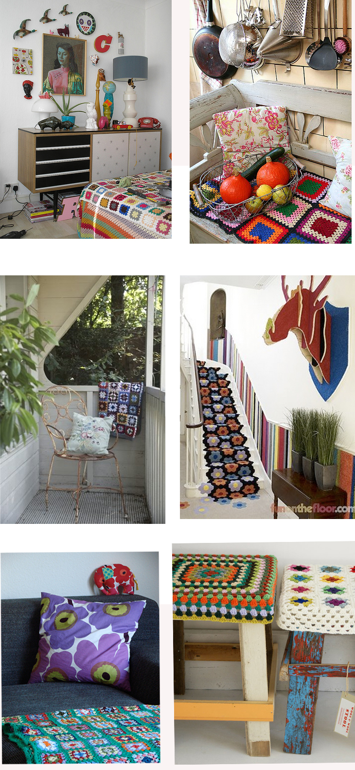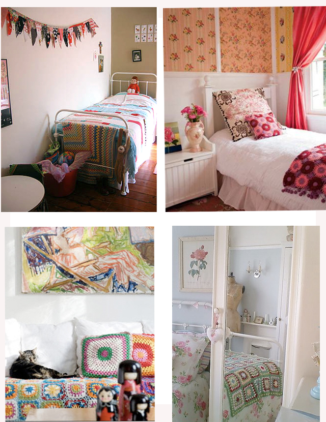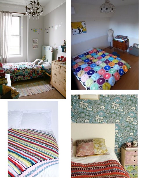 Designers elevated granny chic on spring and fall runways with afghans fashioned as um, fashion. Not sure anyone would actually wear a crochet square getup (other than Mary-Kate and Ashley Olsen, who’ve been spotted with granny square scarves), but the look is taking hold in decors for the under 60 set. A lot of these images are from Flickr, but there’s the usual Anthropologie shot (their displays are always on trend), and a couple from magazines. For additional commentary on the look, see “Trendlet Alert: Crochet” on The Inside Source.