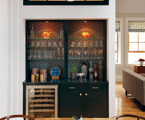 Hughes built in a bar on the back of the entry wall, borrowing space from an oversize coat closet. The couple likes to entertain, so the bar was high on their priority list.