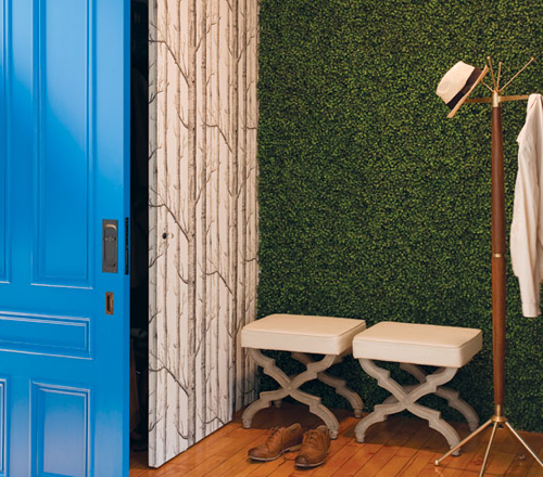A wall of faux boxwood greets visitors when they step off the elevator. It’s a surprise of the after being on the busy city street. The ceiling is painted black to suggest a night sky. The sliding barn-style doors are mahogany doors salvaged from a school in Milton, Mass., painted electric blue. The contractor wasn’t thrilled about painting the beautiful old wood, but Hughes convinced him. Hardware: Barndoorhardware.com; wallpaper: Cole & Sons; stools: Wisteria; coat stand: Abodeon, Cambridge.