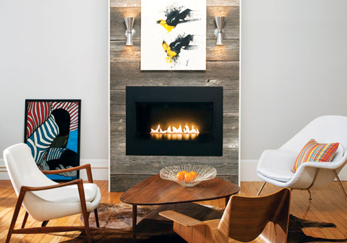 The fireplace is gas from Sparks, with no hearth, for maximum simplicity. Hughes says, ” The theme is rustic meets modern with a little industrial sprinkled on top.” The surround is done in salvaged barn wood from Maine. Hughes started out wanting to line it with old railroad ties, for a log cabin feel, but ran into issues with toxicity. He chose each piece of wood very carefully, some with knots, some with old paint, and planned out exactly which sections of each board he would use. Later, the contractor picked them up and promptly sawed them right in half so they’d fit, nearly causing Hughes a heart attack. “I thought he was kidding, but we made it work.”