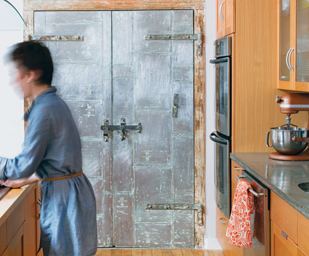 The kitchen was already intact when Hughes was hired, but he did spruce up the old fire doors, and added shelves behind them, creating a shallow space perfect for spice jar storage.