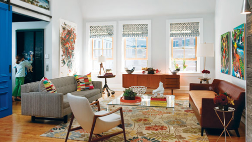 The trick to a mix and match chair ensemble? “Getting seat heights about the same height, so nobody feels out of place, and making sure everyone’s feet are on the carpet, even just one foot, so they feel like they’re in the group. “Coffee table and chair on left: vintage 1950s  from Reside, Boston; Womb chair from Addo Novo, Boston; wood chair by Blu Dot; artwork: Yes.Oui.Si, Boston.