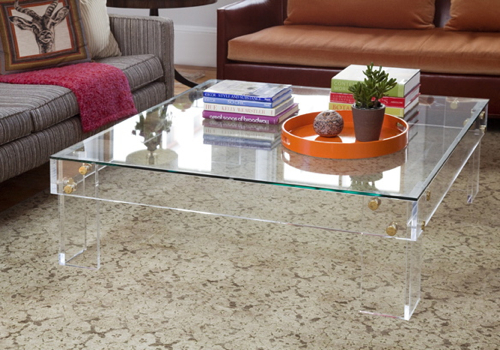 Hughes custom designed the cocktail table, fabricated in Lucite by Altec Plastics in Boston. (Yes, the rug is different in this photo, which I took when I visited for the walk-through and interview.)