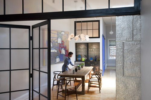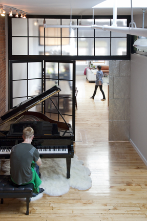 To separate the public and private spaces, Hugh designed the black room divider, fabricated from etched polycarbonate. The cloudy finish allows light through, but obscures the mess of toys and such behind it. The shiny tin panel on the right is a pocket door. The piano sits on an oversize sheepskin rug (six pelts sewn together) from Bowron Sheepskin in New Zealand.