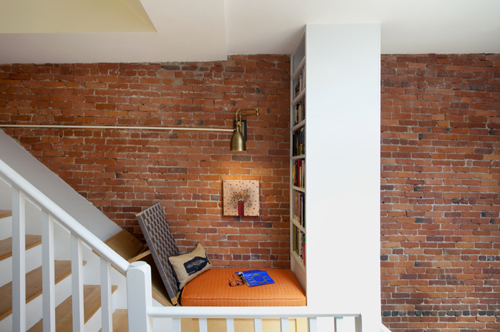 Hughes designed an ingenious reading nook at the foot of the stairs, modeled on the outdoor lawn chairs of his youth. The adjustable back is woven with seat belt fabric. The cushion lifts up for storage. The bookcase is extra deep, and accessible from both sides.