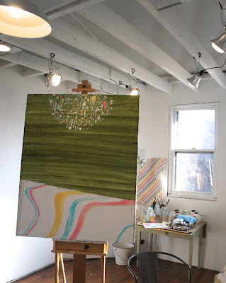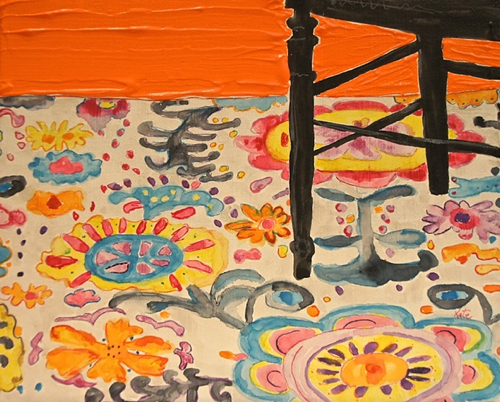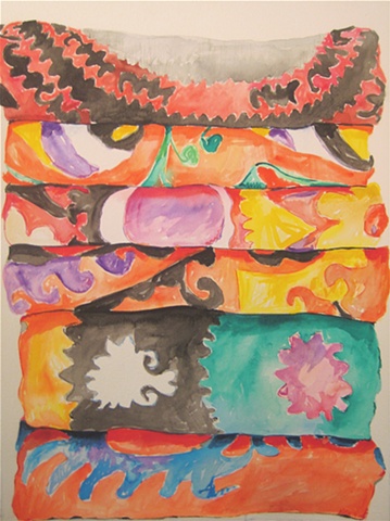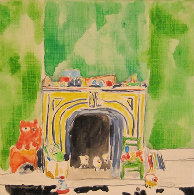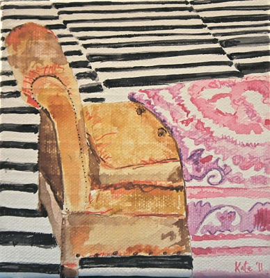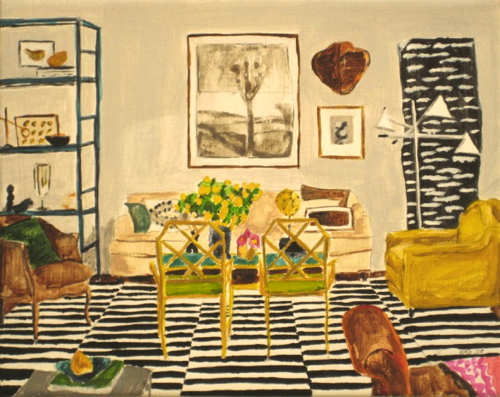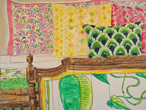 Influenced by the rehabbing and decorating of her Victorian home, Chicago artist Kate Lewis creates interior paintings in acrylic and watercolor. The scope ranges from full rooms to the details, like a sliver of a stack of kilim rugs. All are full of wonderful color and pattern.