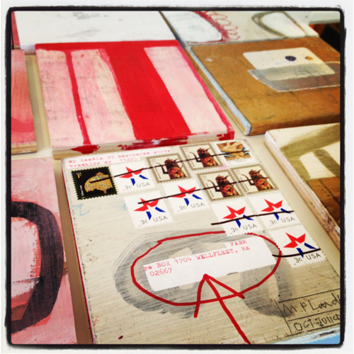 Brooklyn-based artist M.P. Landis puts postage stamps directly on the back of each piece (mixed media on wood), and sticks them in the mail addressed to Farm.