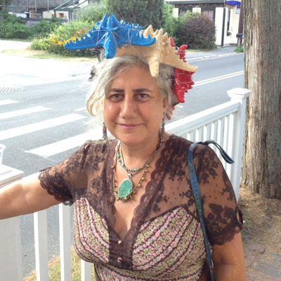 Julia Salinger wearing a starfish fascinator of her own creation. Fresh off a fellowship in Italy, she opened her new studio space, Mermaid’s Garage in Wellfleet this week.