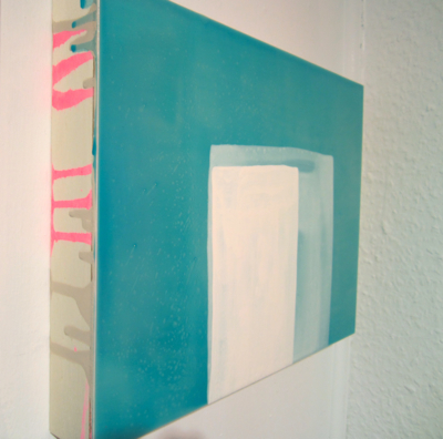 This is my favorite piece. The series was inspired by Vasileff’s the play of sunlight in a Mies van der Rohe house—she grew up in one. It’s acrylic on board, but looks like encaustic. I love the fluorescent pink drips of paint on all the edges.