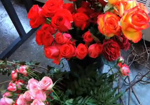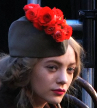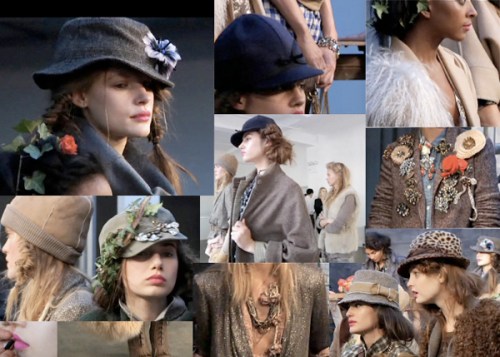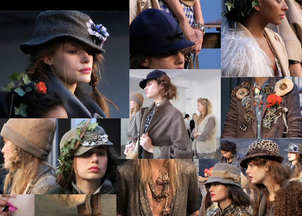 Looks like the stylist borrowed flowers from the arrangement in the studio. Or maybe they were ordered just for the purpose of sprucing up the hats, of which there are many.