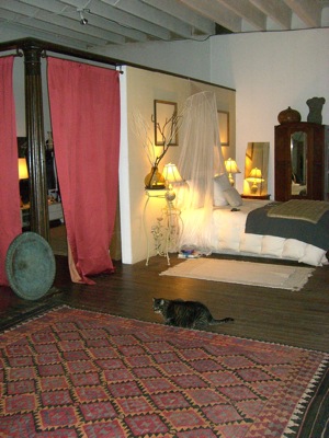 The view upon entering. The red-curtained area on the left is the walk-in closet/boudoir. When she first moved in she says, “There was debris everywhere, and weird makeshift tables bolted to the walls. But. . . this place was such a canvas.”