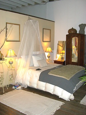 Mosquito netting keeps the bed area cozy in the wide open space. She found the bedside tables and lamps at Marshalls.