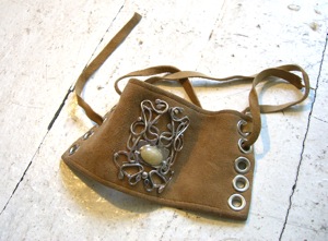 A suede corset cuff with silver-work and cabachon stone, from Nyx Studio.