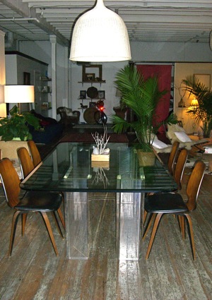The glass dining table was here when she moved in, left behind by the photographer who occupied it before her, who came from a wealthy family. She says, “I have this vision that her elegant, totally ’70s parents with blue eye shadow and shag carpeting gave her this, but she never really liked it. It takes someone looking at it from a totally different angle to appreciate it.” The chairs are Plycraft, from her mom. The pendant is wicker from IKEA.