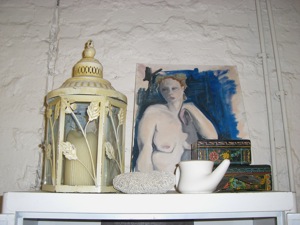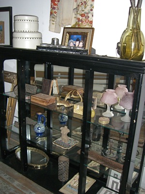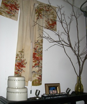 A kimono from her mom hangs above the cabinet. The tree branches came from a walk in the woods in Ipswich, Mass.