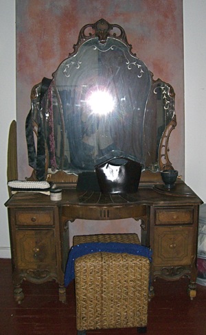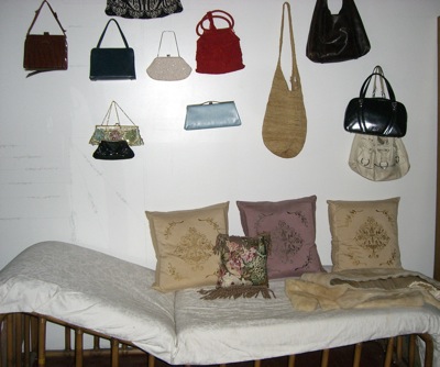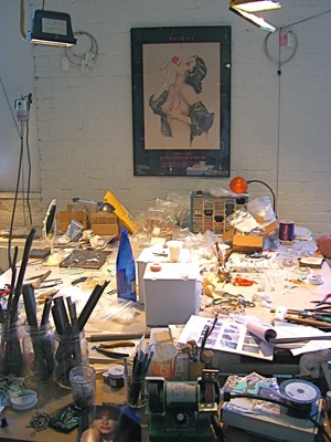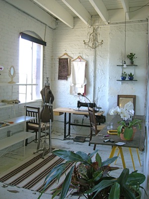 The studio is just beyond the living room, and can be closed off with an old burlap curtain she hung. This is the work table at which she makes all her jewelry.