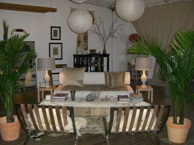 An overview of the living area. The pair of chairs are Barcelona lounges without the cushions. She got them from two guys who rescued them from a couple who left them behind when they moved to California. Lamps next to the sofa were $3 each at Goodwill.