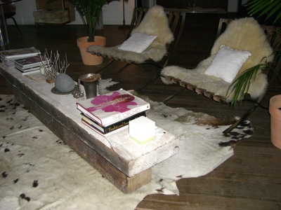 A closeup of the sheepskin draped Barcelona lounges. (Sheepskins from her mom, who got them at Costco.) The coffee table are just pieces of timber she found in an empty unit in the building.