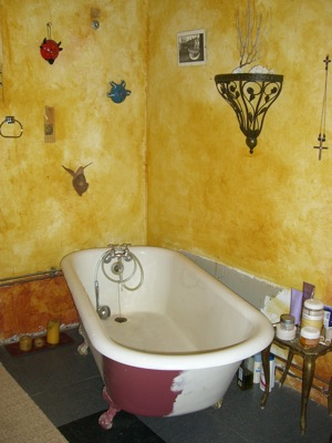 When she moved in , there was no shower or tub. Nicole and her brother found this tub in another unit in the building, dragged it over, and hooked it up.