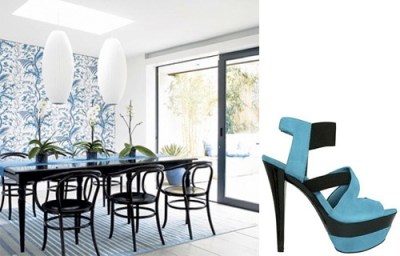 This clear blue and white room with glossy black accents from House to Home magazine is perfection. I adore the George Nelson pendants, bentwood chairs, leafy wallpaper, and black-framed sliding door. SHOE: Jessica Simpson Malika Platforms ($98).