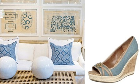 Chambray and white cotton duck is softened with a light wood coffee table and a series of pretty, uniformly framed artworks. Photo from Coastal Living magazine. SHOE: Ivanka Trump Lark Wedge Espadrille Cork Wedges ($135).