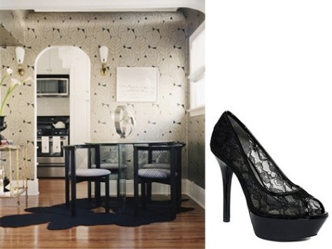 This art deco style wallpaper of stylized leaves is black and taupe is wonderful. Who knew black lacquer dining chairs could work so well? Los Angeles design firm From the Desk of Lola, obviously. The rug adds an air of relaxedness, and the brass sconces draws the eye up to the arched doorway. SHOE: GUESS Nancille Peep Toe Lace Platform Pumps ($79.20).