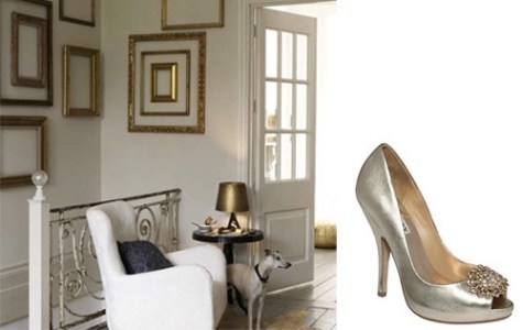 Gold looks almost comfy when used with off-white walls, plain furniture and a well-worn wood floor. Hanging empty frames within frames is genius. Must hunt for some on eBay. Photo from Living Etc. SHOE: Badgley Mischka Lissa Gold Metallic Evening Pump with Rosette ($245).