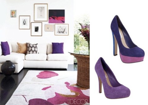 A pair of purple pillows and deeply saturated landscape painting in shades of violet and red pick up on the colors in the gorgeous floral rug. There’s just enough color t0 seriously prettify an otherwise plain white room, featured in Elle Decor. SHOES: Steve Madden Beasst Platform Pumps ($99) and SHOES: Steve Madden Traisie Platform Pumps ($89).