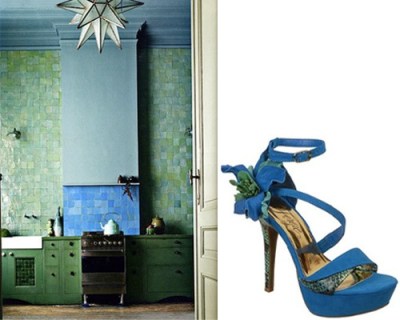 This Moroccan-inspired kitchen by Rum Interior Design, sourced from Apartment Therapy, is beautiful, with its soaring ceilings, painted cabinetry, and gorgeous tile work. SHOE: Fergie Shoes Corsage Sandals ($129.95).