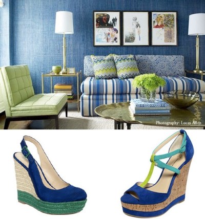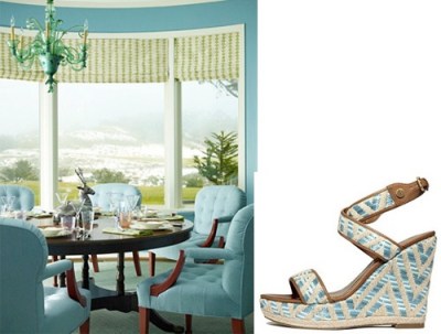 Another turquoise and lime palette, this one by New York City-based designer Katie Ridder, who is one of my favorites. This is her parent’s dining room, and appears in her book. I love the more formal dining furniture and chandelier in this clearly summery locale. SHOE: Ivanka Trump Halyn Wedge Espadrille ($150)