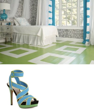 I found this crisp, summery room on the blog Bright, Bold, Beautiful. The turquoise and green scheme are exactly that of our house on the Cape; a combo I never get tired of. I love the glass lamp and the fun painted floor paired with the more glam mirrored nightstand. SHOE: Jessica Simpson Evangela Platforms ($110).