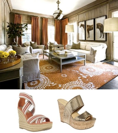 Another orange room I like, this one designed by Atlanta-based lovely Melanie Turner. Great horse triptych and love the whimsical floral rug. SHOES: Mia Shoes Renegade Wedges ($47.20) and Nine West Larysa Gold Metallic Croc Platform Cork Wedges ($79).