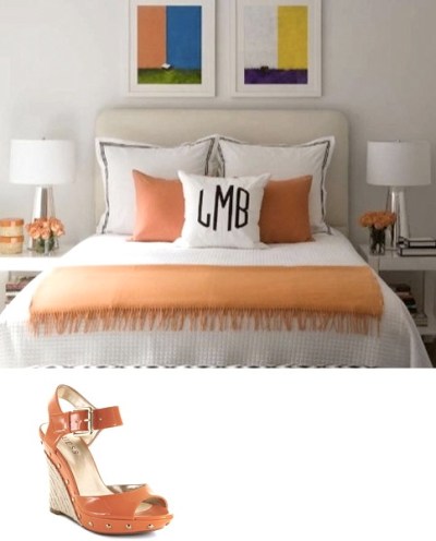 I’ve always liked this tailored bedroom designed by Lynn Morgan and featured in Connecticut Cottages & Gardens magazine. The preppy colors and monogram pillow is tempered by the Rothko-like abstract art. SHOE: GUESS Tabari2 Patent Wedges with Studs ($99).