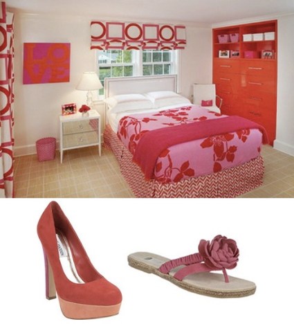 Super fun and brightly colored room (a guest room perhaps?) by New York designer Robyn Karp. I wish I knew the trick to making so many different patterns work so well together. I also love those built in lacquered drawers and shelves. SHOES: Steve Madden Beasst Platform Pumps ($99) and Dr. Scholl’s Iris Thongs with Rosette ($45).