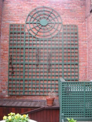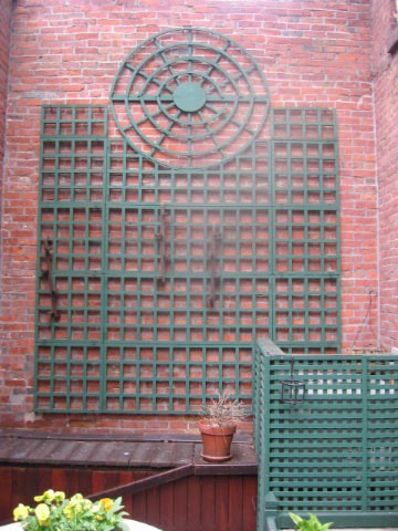 Feehan managed to incorporate similar architectural elements, as well as a water feature. The first order of business was to paint the preppy green lattice with flat black paint, so it would recede. (They didn’t want to remove it since it hides the air conditioner condenser.)