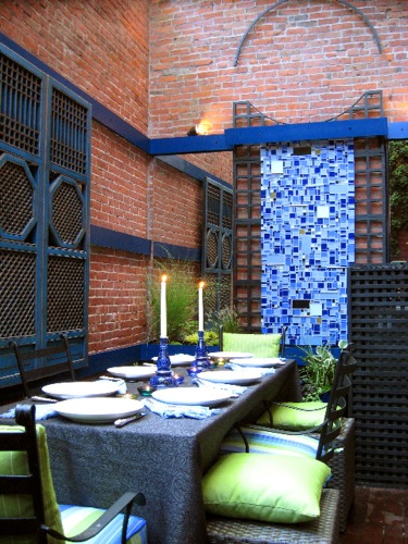 Today I had planned a post on the Traditional Home digital issue of TRADhome, which launched on Friday. However, I don’t have the photos I need since my laptop is in the shop. So I dug into the archives of my old machine. This is based on a piece I wrote for Boston Globe Magazine, “Kind of Blue.” It’s about how a tiny patio in Boston, was transformed with the help of Brian Feehan, a director and choreographer, from a blah backyard into an entertaining oasis, inspired by Majorelle Garden* in Morocco, which the homeowner had recently visited.