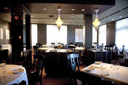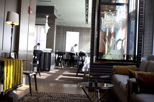 As fitting for a high-end, special occasion spot (she’s hoping diners will wear jackets), the décor, designed by Cheryl and Jeffrey Katz, is subdued. Looks like the entry has some nice details, and the Moroccan style lighting in the dining room keep it from coming off as dull.