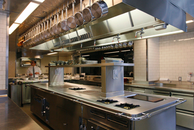 There’s a view of the kitchen from the chef’s table, a glass-fronted room at the back of the kitchen. The space includes a silver banquette runs the entire length of the room, Philipe Starck ghost chairs, a faux-bois floor, malachite wallpaper, and stark graphite drawings of trees and flora by Dean Brown. Nineteenth-century reproduction French garden mural wallpaper covers the hallway leading to the private dining room. I wish I had a pictures!
