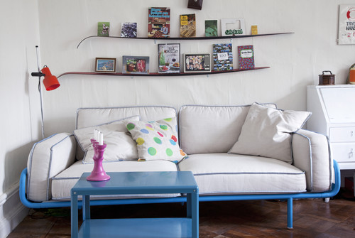 Inspiration: She stumbled upon an IKEA tea trolley when browsing old catalogs. They’re old fashioned items, but “there’s still a need today for mobile things.” The casters on this coffee table make it mobile, and there’s a shelf for storage.