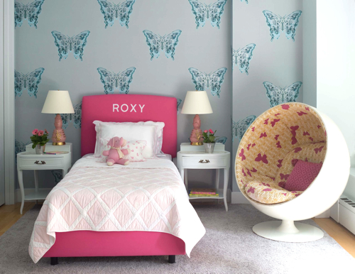 New York interior designer Fawn Galli paired Timorous Beasties “Butterfly Hand-Print”  on the wall with Mod Green Pod “Butterfly Jubillee” on the chair.