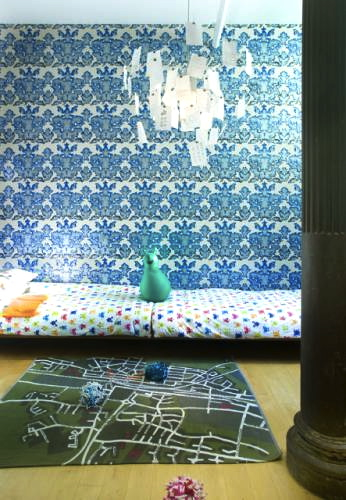 Stefan Boublil, co-director of New York interior/graphic design company The Apartment, chose Timorous Beasties Euro Damask for his five-year-old son Zoel’s loft bedroom. (via Little Big Magazine)