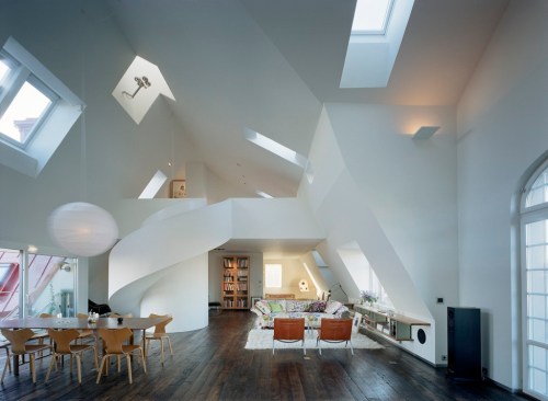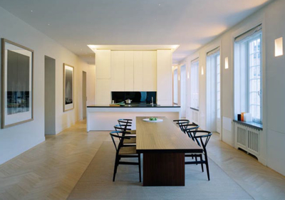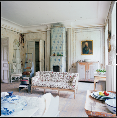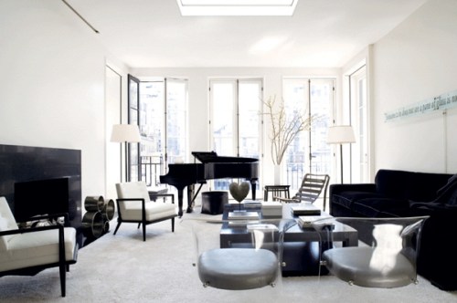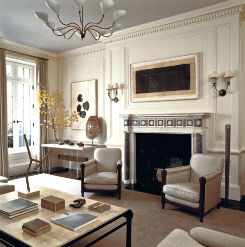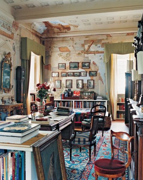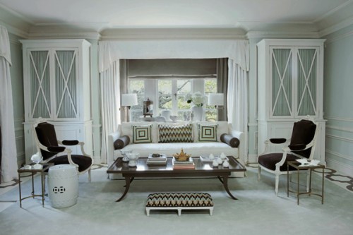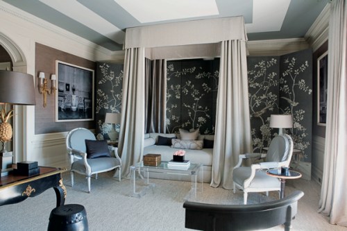 A room in the Veranda Greystone Mansion Show House. Mary aimed for the aura of an haute couture salon in Paris. The trim is painted a creamy semigloss adn the wall panels are covered in a Phillip Jeffries ultrasuede. The daybed is a low tuxedo sofa hung with a Zoffany fabric. I thought the back wall was covered in wallpaper, but it’s actually a hand-painted chinoiserie screen. Loving the acrylic Allan Knight coffee table and the painted striped ceiling. The large photos are interior images of Moscow’s Ostankino Museum, by Miguel Flores-Vianna, who shot many of the photos in this book.