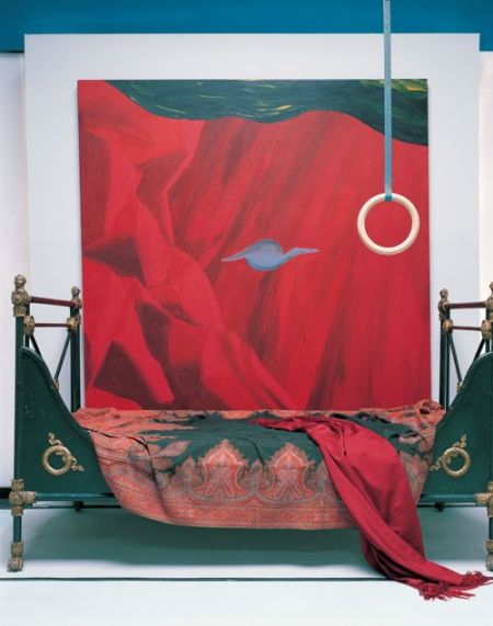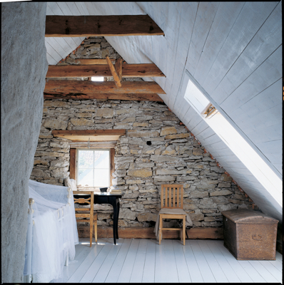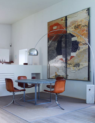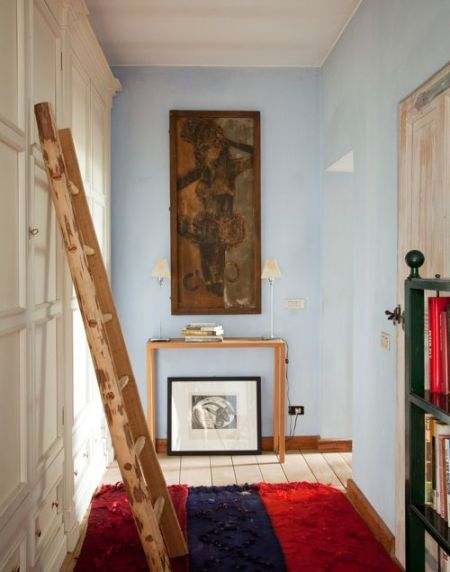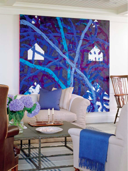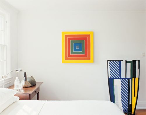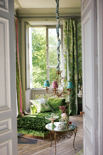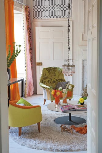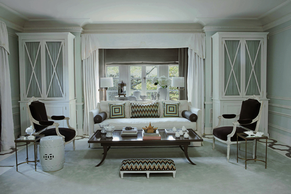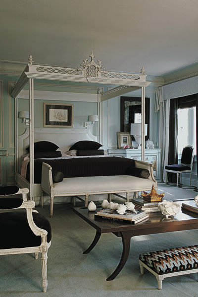 Mary’s aqua and white bedroom with millwork, which she had made for the room, reminds her of a fondant cake. She based the design of the bed on a Thomas Chippendale cabinet she spotted in a book. The supports are faux bamboo; the fretwork and carved pagodas are fabulous. The klismos leg coffee table was custom made; the graphic upholstery of the footstool adds a dash of ’70s style.