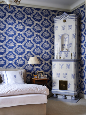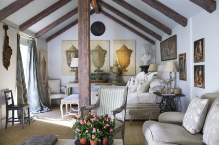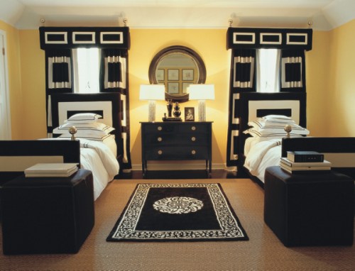 I love the boldness of this room, and the symmetry. I assumed it was a guest room, but no . . . it’s a room for twin girls. Mary designed the twin beds. The finials on the footboards and valance are an interesting detail. Toys? Apparently in baskets on floor-to-ceiling shelves on the other side of the room.