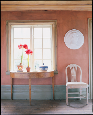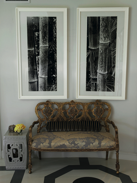 I hadn’t seen this photo before. It’s a detail of either the foyer or dining room of Harkham House in Beverly Hills. I love the stenciled wood floor and the black-and-white photographs (by designer Vicente Wolf) of bamboo, a fun riff on Mary’s usual, more ornate faux bamboo details.