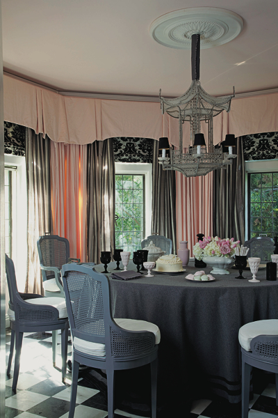The original black-and-white marble floors in Mary’s breakfast room reminded her of Laudrée, a Paris bakery, and was the starting point for the design. The faux French vintage chairs came with the house. She had them lacquered the same gray-flannel color as the tablecloth. The layered window treatment included shell-pink, cotton faille curtains with a pleated valance, a striped under curtain, and black-and-white damask Roman shades. Recognize the chandelier? It’s similar to (or maybe the same plus lampshades) the beaded crystal one in the room above. Mary found it in Paris. So lovely and tres français.